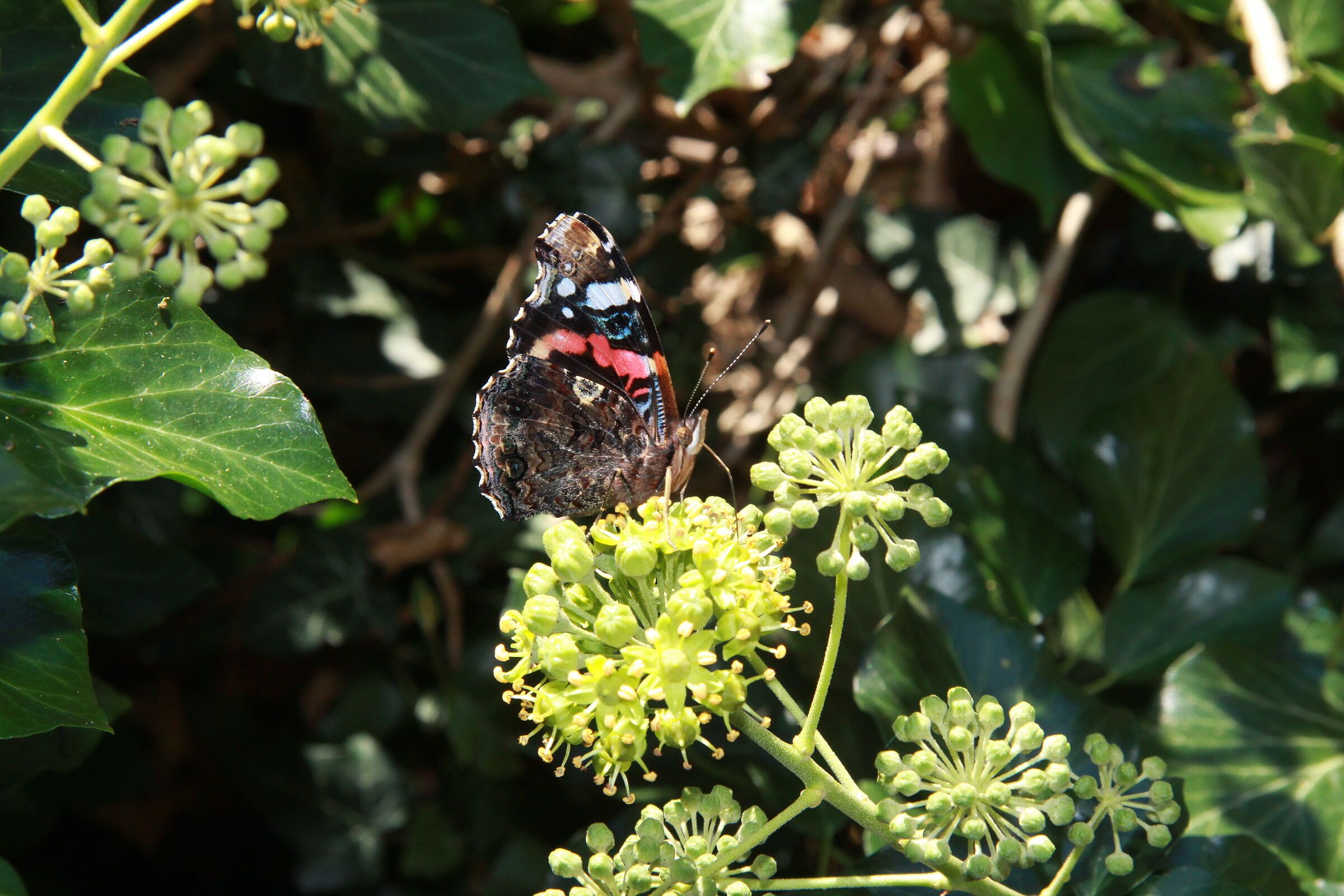 Im übernächsten Kapitel folgen erprobte Pflanzenvorschläge: Aber Schlüsselblumen kann man im Prinzip schon kaufen und bald pflanzen, aber auch z.B. Krokusse, zunächst in Töpfen auf der Terrasse. Im nächsten Jahr dann zum Verwildern auf dem Naturrasen. Vormerken kann man auch schon mal den Garten- oder Zier-Salbei (salvia nemorosa) für das Staudenbeet: den ganzen Sommer über ist er voller Bienen und Hummeln - bis in den Herbst hinein. Früher ist schon die Küchenschelle dran. Highlight im Sinne eines Naturgartens ist der blühende Garten-Efeu. Ein dichter Busch in einer Gartenecke oder als Sichtschutz zum Nachbarn, 2-3 m hoch, treibt im Spätsommer dichte Blütendolden mit angenehmen Duft. Aber Achtung: man darf lange vorher den Busch OBEN nicht mehr beschneiden, sonst sind die frühen Blütenausbildungen definitiv weg! Dann summt und brummt es bis in den Spätherbst mit Bienen, Hummeln, Käfern und besonders viel Schmetterlingen. Wenn nach trüben Tagen die Herbstsonne noch einmal scheint, sind auch die Efeu-Freunde alle wieder da. Sogar auch die Schmetterlinge! Und am 20.2.2021 sitzen bereits mehrere Zitronenfalter auf den Blütenresten (oder Fruchtständen?) in der warmen Frühlingssonne.